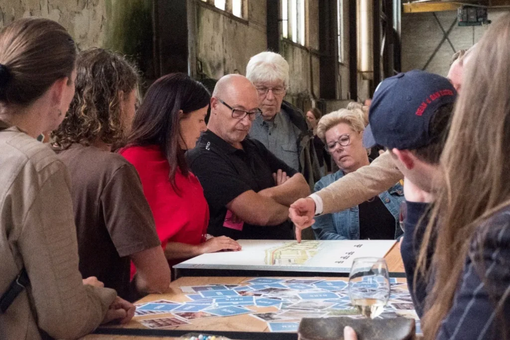 In de bestaande hal hadden we twee sessies georganiseerd; in kleine groepen van maximaal 32 mensen. Verdeeld over 4 thema tafels met maximaal 8 personen, 1;1 in gesprek over ideeën wensen en verlangens. In een Carrousel na 15 minuten wisselen naar het volgende thema.