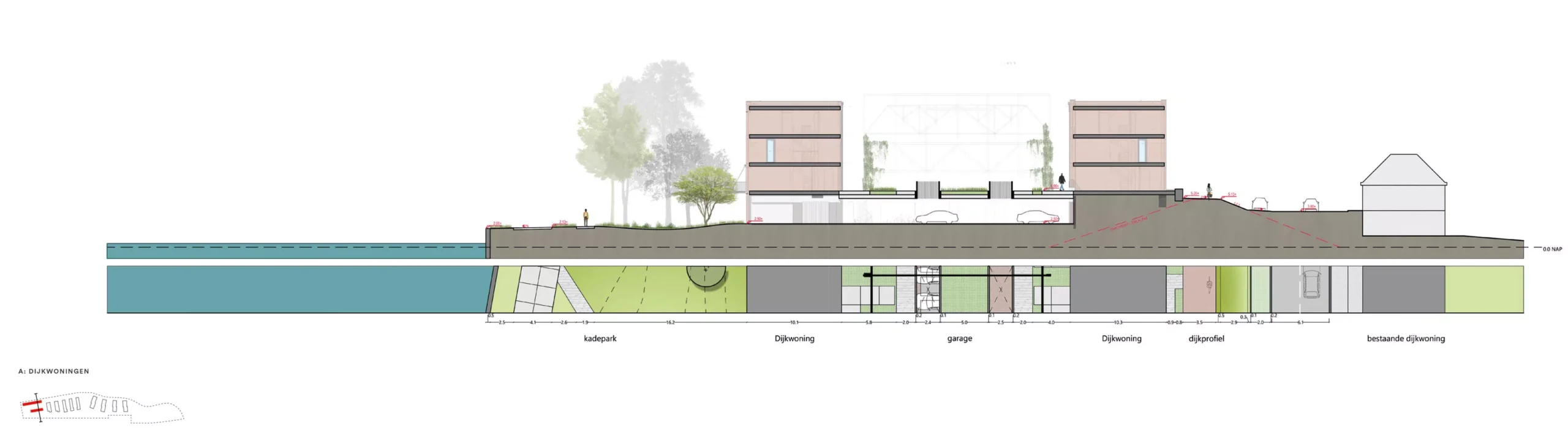 - De gebouwen aan de noordzijde zijn gelieerd aan de structuur van de bestaande bebouwing en staan deels langs en deels haaks op de dijk, de gebouwen aan de zuidzijde volgen de landschappelijke structuur van de dijk;