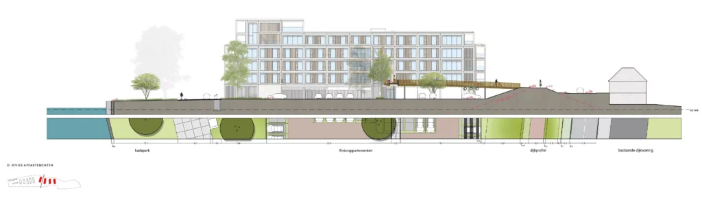 - Zicht op de rivier: dit krijgt vorm door tussen de gebouwen voldoende ruimte te laten voor ruimte zichten op de rivier;