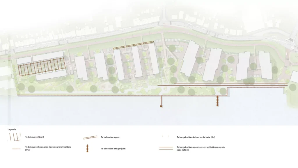 De dijkwoningen worden gebouwd als hofje om de oudste hal van het terrein. Gedeeltes van de oude constructie blijven staan en dienen als pergola voor de binnentuinen. De stoere baksteen verwijst naar oude gevel van de oorspronkelijke hallen. De dijkwoningen kijken uit op de molens van Kinderdijk, de Kade woningen hebben zicht op het kade park en de rivier de Noord.